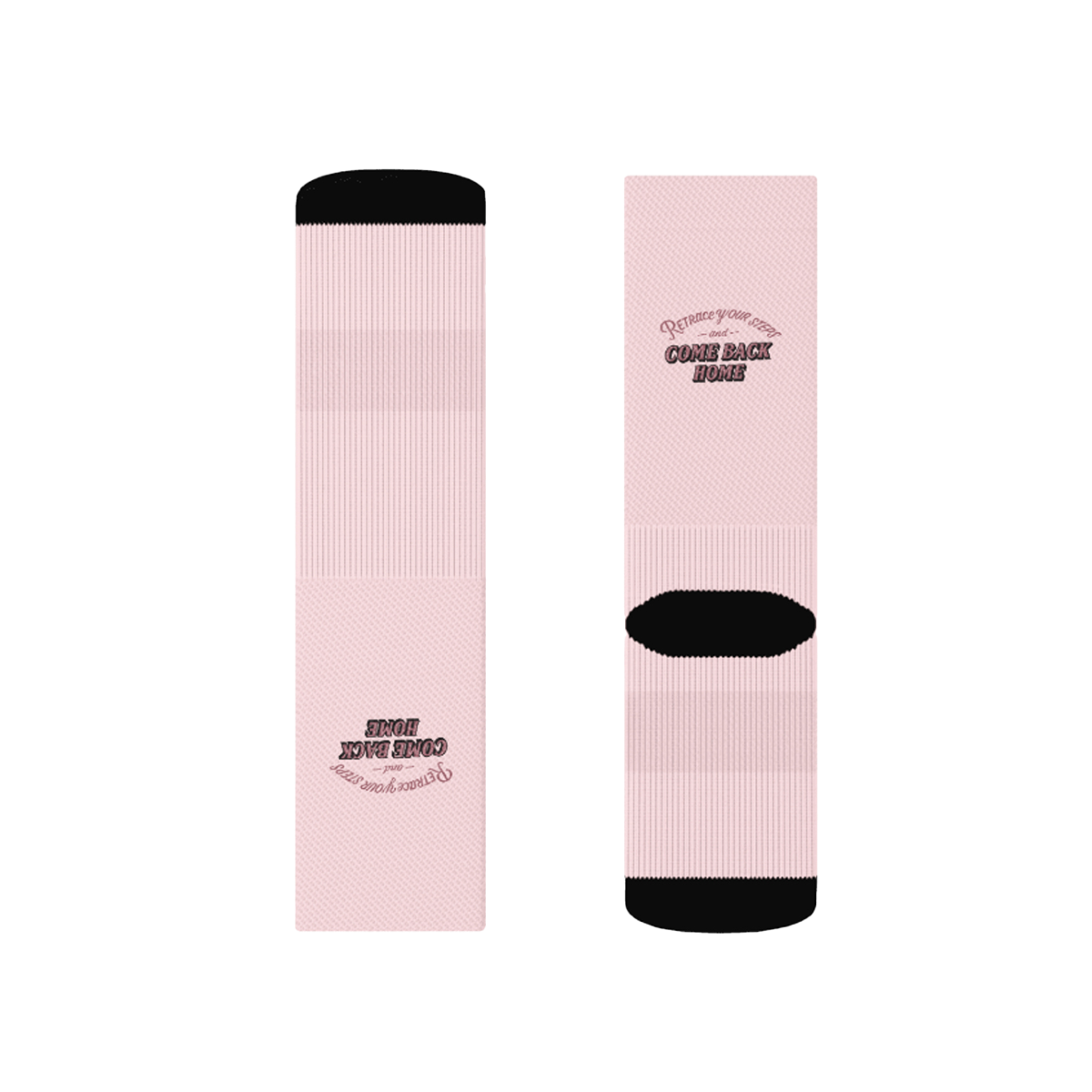 "Retrace Your Steps and Come Back Home" sublimated on 95% polyester 5% spandex pink socks.