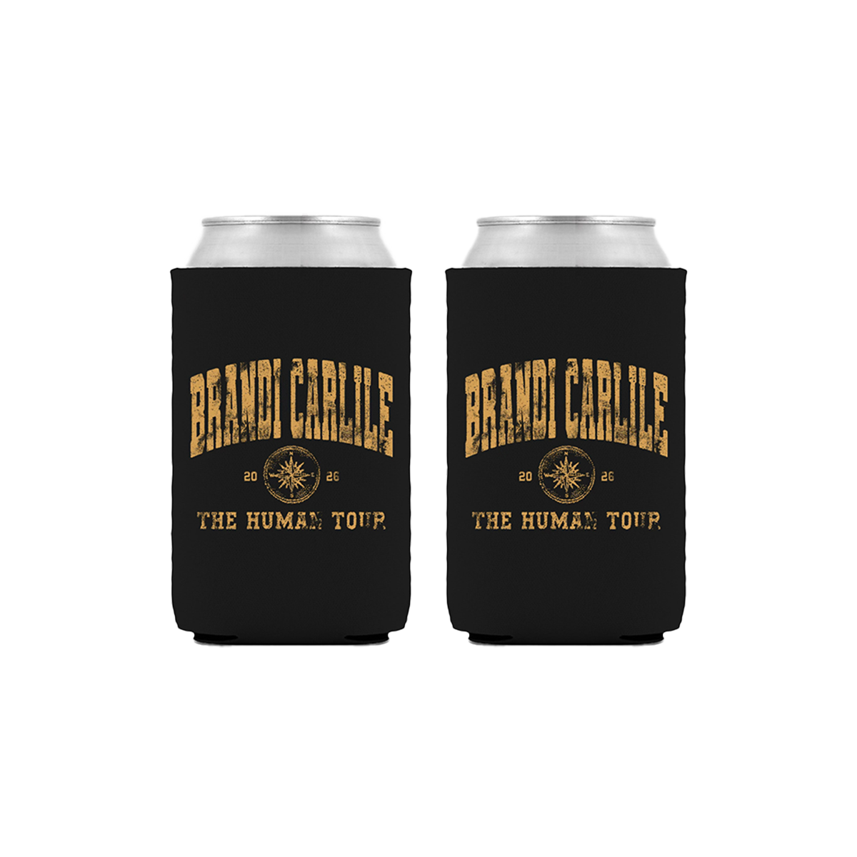 Brandi Carlile 2026 The Human Tour graphic featured on the front and back of a 12 - 16 oz. black foam can hugger.